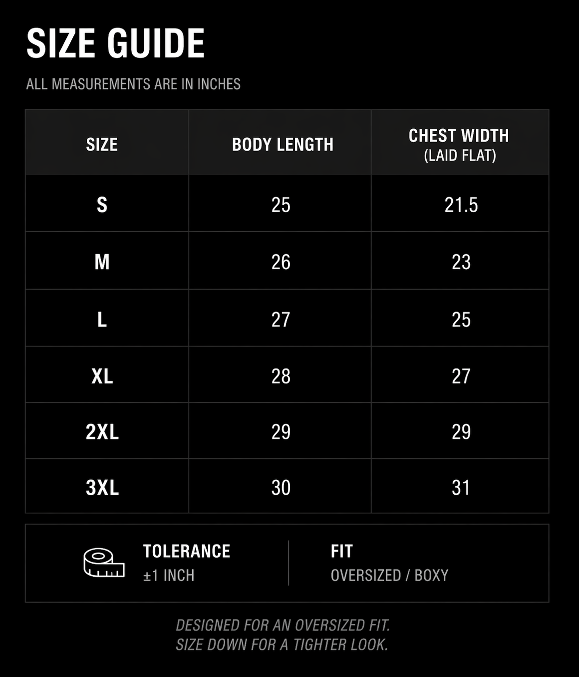 Due to the oversized jumbo print placement—spanning from the bottom hem upward and across the width—this style is produced in sizes M and up to ensure proper print execution and visual impact.
